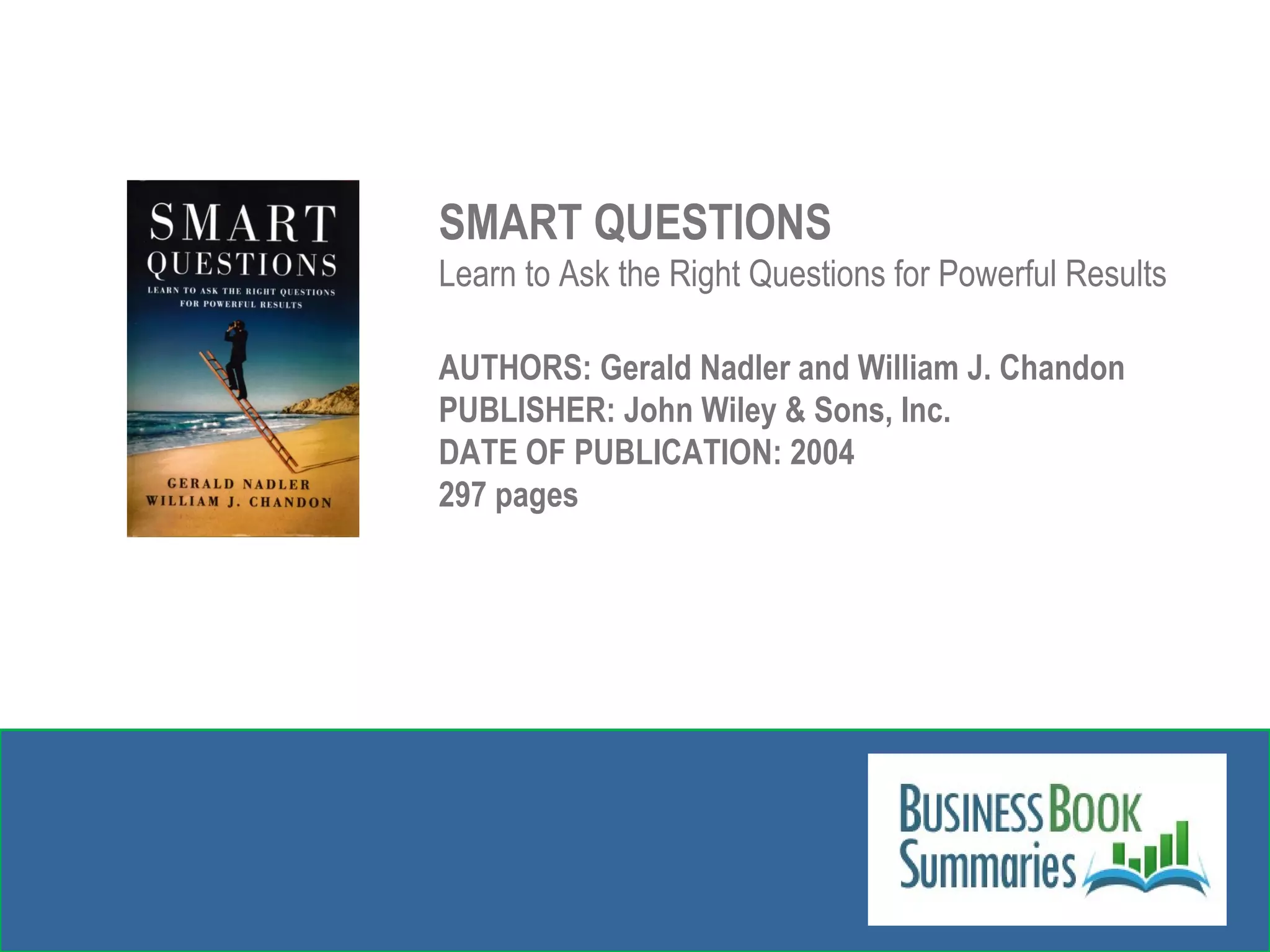 The book 'Smart Questions' by Gerald Nadler and William J. Chandon presents a holistic framework for effective problem solving across various sectors, emphasizing a method that contrasts with traditional reductionist approaches. It outlines the Smart Questions Approach (SQA), which involves stakeholder involvement, refining problem statements into purpose statements, envisioning ideal future solutions, and developing actionable living solutions. By applying SQA, organizations can create lasting, breakthrough solutions rather than temporary fixes often resulting from standard methodologies.