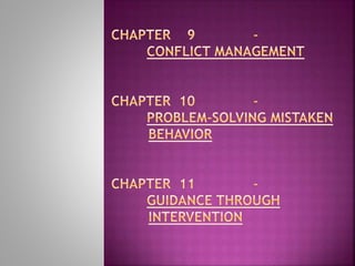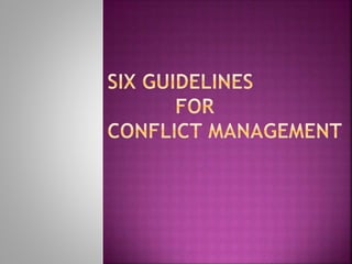This document discusses conflict management strategies for early childhood classrooms. It begins by defining conflict for young children and explaining why it is a natural occurrence. It then discusses techniques for mediating conflicts, including using peace props like talk-and-listen chairs. The document also explains a 5-step conflict mediation model called the "five-finger formula" which involves cooling down, discussing problems, brainstorming solutions, agreeing on a solution, and following up. Finally, it provides an example of how to use the five-finger formula to mediate a conflict between two boys arguing over Lego wheels.