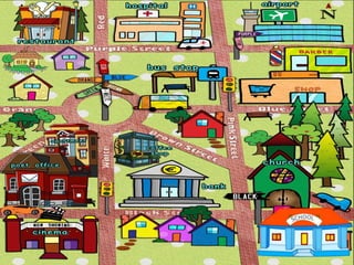 The document provides information about places in a local community. It discusses several locations including a supermarket on Jackson Street where one can buy milk, a newspaper stand in front of the supermarket, a store next to the supermarket where movies and games can be rented, an Italian restaurant across the street known for pizza, and a sports club where karate lessons are offered. It also includes vocabulary words and sample sentences using prepositions of place.