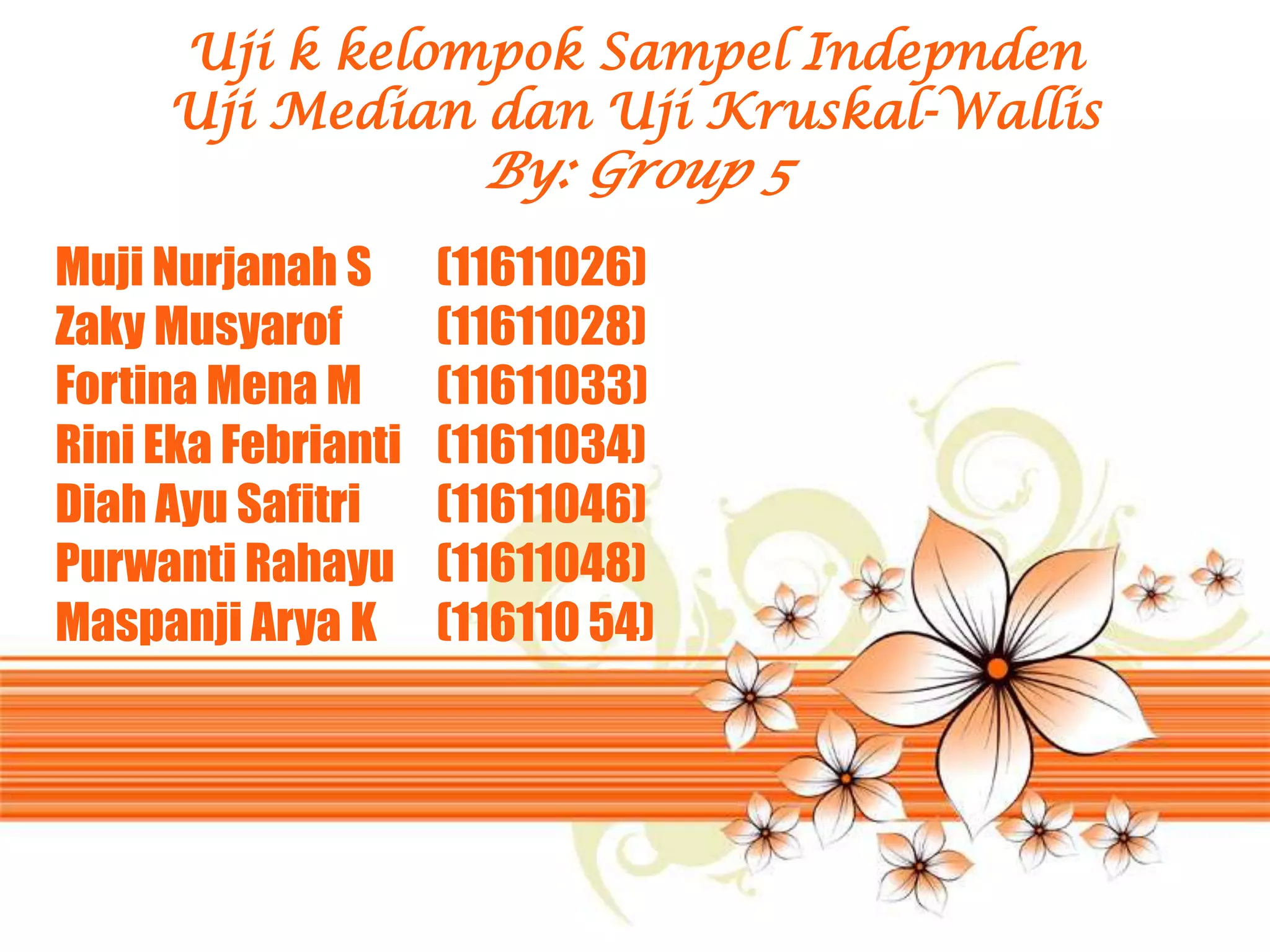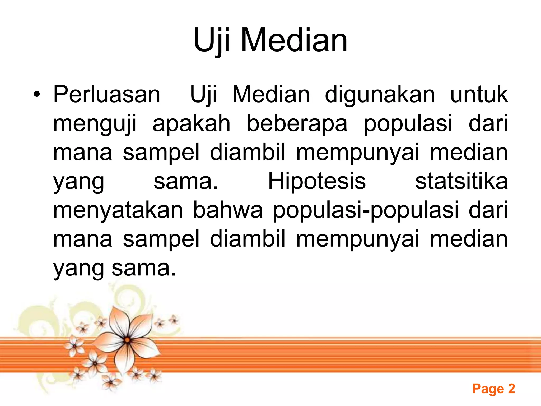 Dokumen ini membahas uji statistik untuk sampel independen, khususnya uji median dan uji Kruskal-Wallis. Uji median digunakan untuk menguji apakah beberapa populasi memiliki median yang sama, sedangkan uji Kruskal-Wallis merupakan perluasan dari uji jumlah rank untuk menguji apakah sampel berasal dari populasi yang sama. Dokumen ini juga memberikan contoh soal uji median dan uji Kruskal-Wallis beserta langkah penger