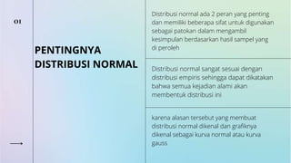 Dokumen ini membahas pentingnya distribusi normal dalam statistik, menjelaskan sifat-sifatnya seperti simetri dan bentuk lonceng. Distribusi normal menjadi acuan untuk analisis data karena relevansinya dengan kejadian alami. Selain itu, dokumen memberikan panduan langkah demi langkah untuk mengubah distribusi umum menjadi distribusi normal baku.