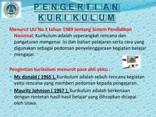 Dokumen ini menjelaskan pengertian kurikulum dan komponen-komponennya sesuai dengan UU No. 2 Tahun 1989 tentang sistem pendidikan nasional. Kurikulum berfungsi sebagai pedoman bagi guru, sekolah, dan masyarakat dalam pencapaian tujuan pendidikan, serta mencakup berbagai aspek seperti tujuan, materi, dan pengembangan. Selain itu, dokumen juga menguraikan prinsip-prinsip dalam pengembangan kurikulum dan struktur kurikulum untuk tingkat SD, SMP, dan SMA.