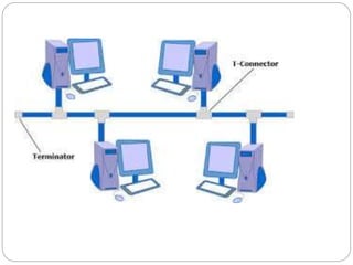 The document discusses various network topologies. It introduces network topology as the arrangement of links, nodes, and other elements in a computer or biological network. It then describes five common network topologies: bus, ring, star, tree, and mesh. For each topology, it provides a brief explanation of the network structure and flow of data. The document aims to present the different types of network topology.