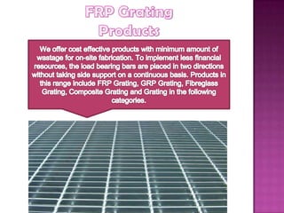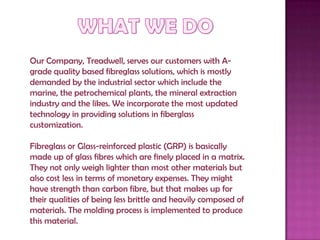 Treadwell serves industrial customers with fiberglass solutions that are lighter, cheaper, and more corrosion resistant than other materials like carbon fiber and steel. They produce fiberglass using glass fibers set in a matrix and molding processes. Treadwell offers fiberglass handrails, ladders, and platforms that are customized for clients' needs and have non-conductive, long-lasting qualities.