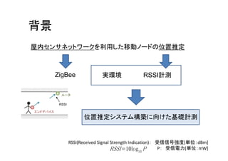 ZigBee å®ç°å¢ RSSIèšæž¬ ã«ãŒã¿ RSSI ãšã³ãããã€ã¹ äœçœ®æšå®ã·ã¹ãã æ§ç¯ã«åããåºç€èšæž¬ RSSI(Received Signal Strength Indication)ïŒ åä¿¡ä¿¡å·åŒ·åºŠ[åäœïŒdBm] RSSI 10log P 10 PïŒ åä¿¡é»å[åäœïŒmW]