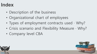 The document outlines an organizational chart and employment contracts for TouchTheSky, including permanent full-time contracts for managerial roles and a training intern contract. It also describes a crisis scenario where TouchTheSky would implement a temporary 20% reduction in employee working hours due to decreased demand. The company's collective bargaining agreement is also discussed, including provisions for holidays, discipline, salary determination, and equality policies.