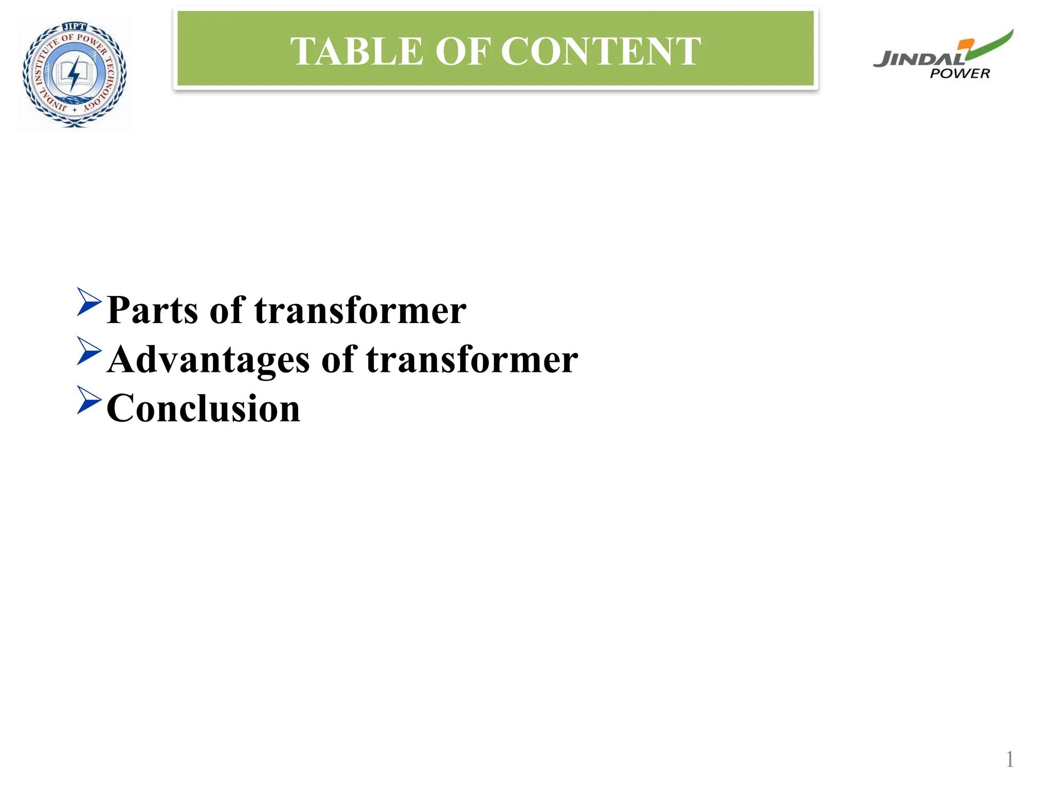 The document is a presentation on transformers, detailing their parts, functions, and advantages. Key components include the laminated core, windings, insulating materials, transformer oil, conservator tank, breather, buchholz relay, radiator, bushing, and explosion vent, each with specific roles in electrical energy transfer and safety. The conclusion highlights that transformers operate on the principles of electromagnetic induction to change voltage levels within AC circuits.
