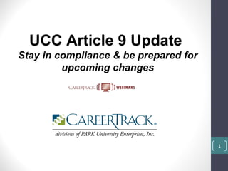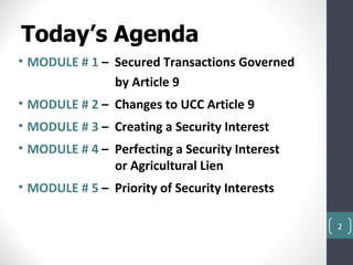 The document discusses upcoming changes to UCC Article 9 including clarifying rules around control of electronic chattel paper, location of debtor provisions, and continued perfection following a change in governing law. It also covers creating a security interest, such as how attachment works for future advances and automatic attachment for certain collateral types. The presentation provides an overview of the revisions and important concepts in secured transactions.
