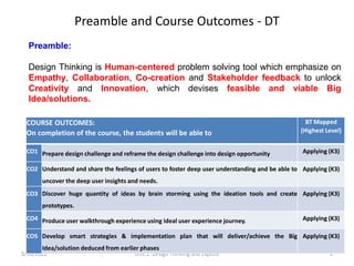 The document outlines a course on design thinking, emphasizing its human-centered approach to problem-solving through empathy, collaboration, and stakeholder feedback. It details course outcomes, assessment patterns, and the five phases of design thinking, as well as its adoption by leading brands and universities. Additionally, it highlights the iterative nature of the design thinking process, encouraging creative solutions that improve user experiences.