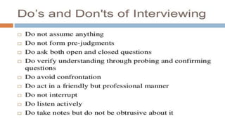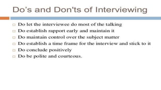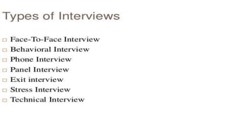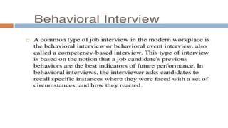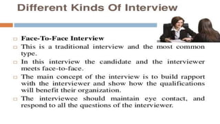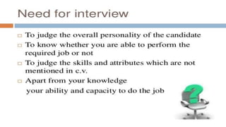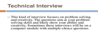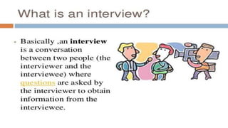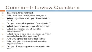 The document outlines the importance of interviews as a two-way exchange of information between interviewers and interviewees, emphasizing the need for effective preparation. It provides extensive guidelines on researching the company, anticipating questions, and planning attire while addressing mental readiness and the necessity of confidence. Overall, it serves as a comprehensive guide to succeeding in job interviews by preparing thoroughly and presenting oneself well.