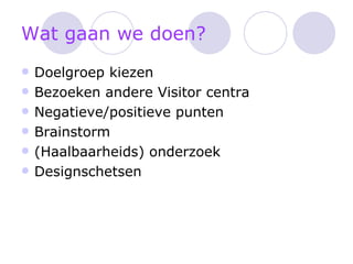 Ppt Vc[1] 1. ‘ Visitor Center’ Hogeschool Rotterdam Marina Abendroth Varcha Bissumbhar Daniëlle Burema 2. Wat gaan we doen? Doelgroep kiezen Bezoeken andere Visitor centra Negatieve/positieve punten Brainstorm (Haalbaarheids) onderzoek Designschetsen 3. 4. Hoe gaan we het doen? Zwevende kiezers krijgen een Navigator Stap voor stap door hun keuze traject. Simpele aspecten zoals de muur en trappen een innovatief tintje geven 5. 6. 7.