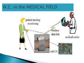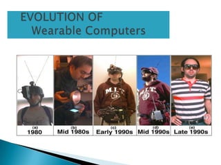 The document provides an overview of wearable computers, including their design, history, and implementation. It discusses the pros and cons of wearable technology, highlighting its potential for enhanced communication and convenience, as well as challenges such as cost and potential privacy issues. The future of wearable computers is emphasized, predicting that they will become increasingly integrated into everyday life and electronic devices.