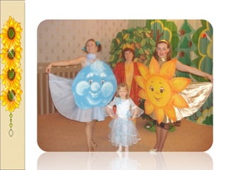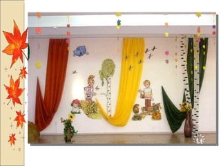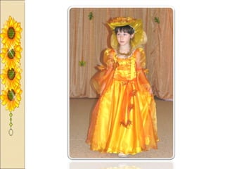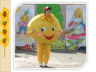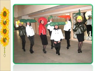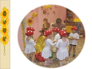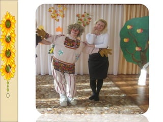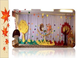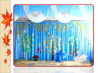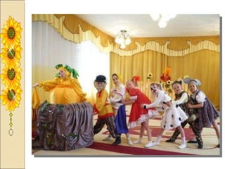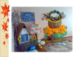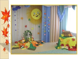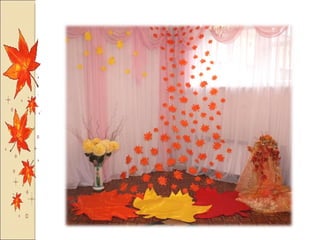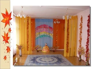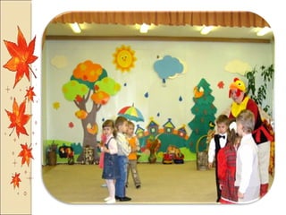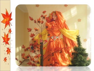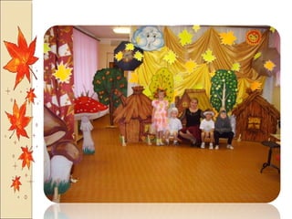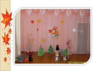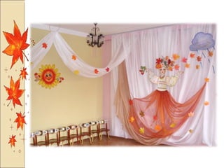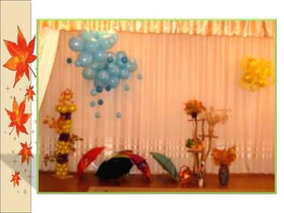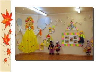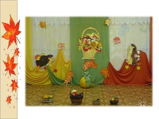 Презентация посвящена оформлению осенних праздников, подготовленной музыкальным руководителем А.М. Медведчиковой для ГДОУ No 7 в Пушкине в 2011 году. В документе содержатся рекомендации по костюмам и маскам для инсценировок, которые будут использоваться в праздниках. Основное внимание уделяется творческим идеям для оформления мероприятий.