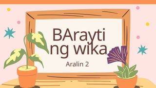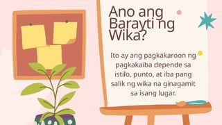 Ang dokumento ay naglalarawan ng mga barayti ng wika na nakaapekto sa pagkakaiba-iba ng wika batay sa heograpiya, lipunan, edukasyon, edad, at iba pang salik. Kabilang dito ang dayalekto, sosyolek, jargon, etnolek, idyolek, ekolek, pidgin, creole, at register na may kani-kaniyang katangian at halimbawa. Ang bawat barayti ay nag-aambag sa pagkakaiba ng estilo at gamit ng wika sa iba't ibang konteksto.