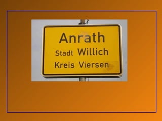 The document provides information about the German town of Willich and its surrounding areas. It describes the history and landmarks of Willich, Anrath, Schiefbahn, and Neersen. Some highlights mentioned include the churches of St. Katharina and Schiefbahn, the Stahlwerk Becker industrial area, various annual festivals and events, and historical sites like the castles of Anrath and Neersen. Recreational activities and facilities are also noted, such as sports fields, hiking paths, and swimming areas.