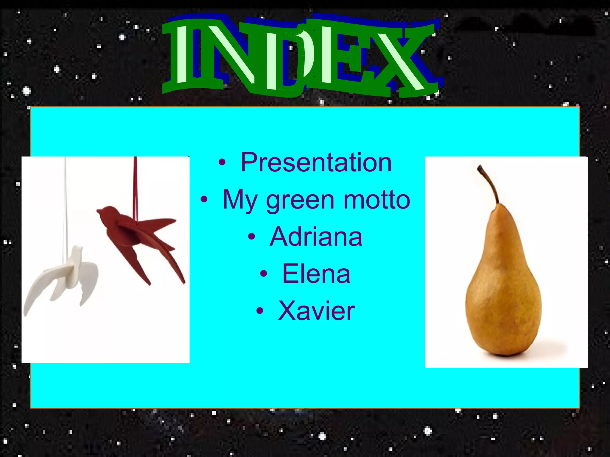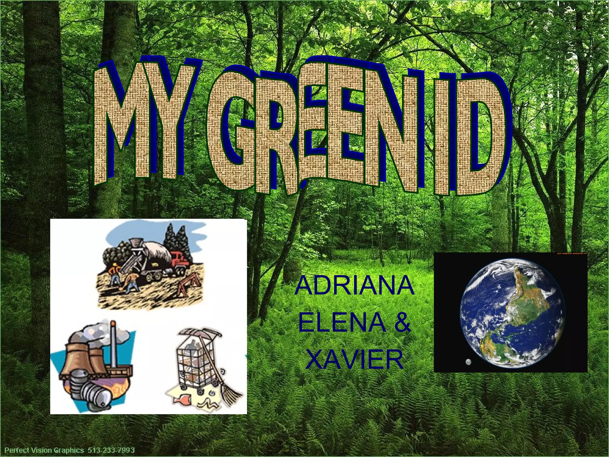 The document introduces three 12-year-old students - Adriana, Elena, and Xavier - and discusses their green habits and motivations. Adriana loves nature and recycles paper, plastic, and organic materials. Elena's family recycles water and paper, plastic, and glass, while she recycles those materials plus batteries, aluminum, and ink cartridges. Xavier aims to not pollute and his family recycles cold water and reused paper, plastic, and glass.