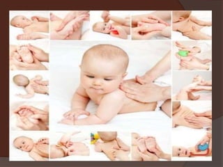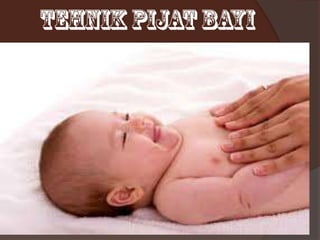 Dokumen ini memberikan informasi tentang pijatan bayi yang dilakukan dengan lembut untuk manfaat kesehatan bayi. Ada beberapa cara memijat yang dijelaskan seperti memijat dada, paha, kaki, wajah, perut, dan tangan bayi dengan gerakan memutar, menggeser, dan meremas secara halus. Pijatan bayi dapat menenangkan bayi, melemaskan otot dan sendi, serta membantu mencegah sakit perut dan menyem