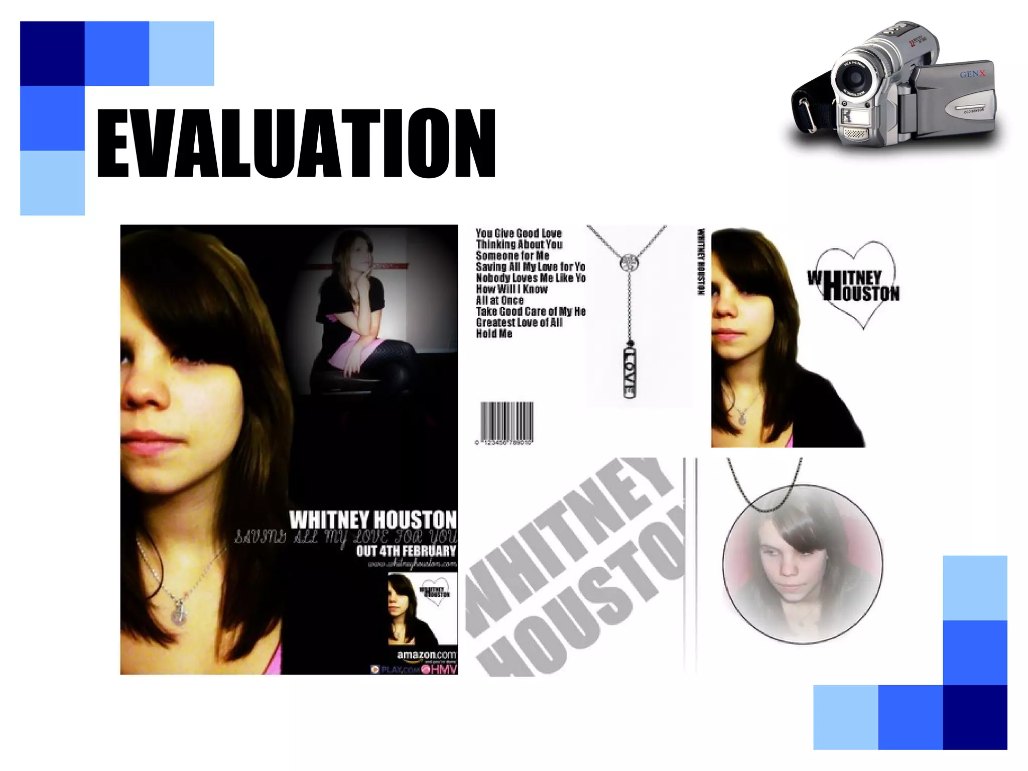 The document discusses the evaluation of the student's media products which were created to portray the feelings and meaning of the song "Saving All My Love for You" by Whitney Houston. The student analyzed various artists to understand conventions and applied them to their own video, poster, and album cover. They received feedback from audiences at different stages of development and made changes accordingly. The student also discusses how their products fit with Andrew Goodwin's theories of music videos and demonstrates intertextuality. Overall, they are pleased with combining their main product and ancillary texts but learned they could have improved their planning and filming skills for the video construction.