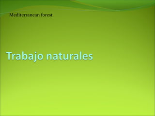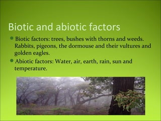 The document discusses the biotic and abiotic factors, food web, climate, and vegetation of Mediterranean forests. Mediterranean forests are characterized by dry summers and rainy winters and contain trees, bushes, thorns, weeds, rabbits, pigeons, dormice, vultures, and eagles. The abiotic factors include water, air, earth, rain, sun, and temperature. This type of forest is found around the Mediterranean Sea as well as in parts of California, Australia, South Africa, and Chile.