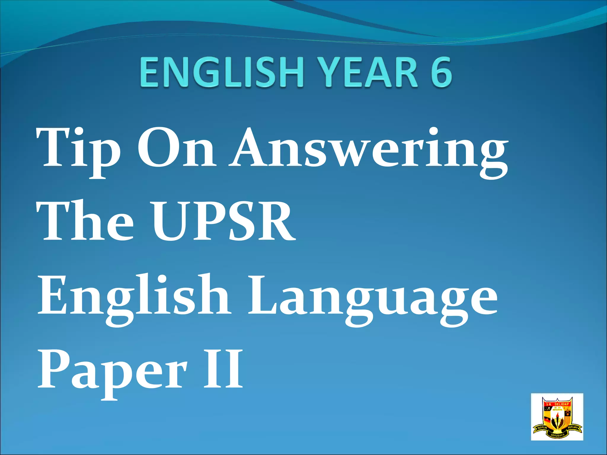 The document provides tips for answering the different questions on the UPSR English Language Paper 2 exam. For question 1, students should look carefully at the picture, relate the helping words to the picture, and construct simple present tense sentences. For question 2, students need to be careful with spelling, capitalization, and punctuation when transferring information. They should also clearly write their choice in the provided space. For question 3, students should look carefully at the pictures and words, understand the word meanings, and construct one or more sentences for each picture using all the words while paying attention to structure, spelling, punctuation, and legibility. Sentences should relate to the picture situations, and students are advised to write the story in three paragraphs.