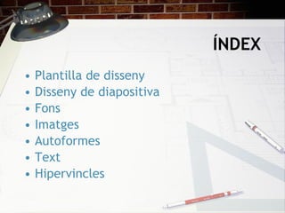 PRÀCTIQUES Posar unatransició a cada diapositiva Posar una animació a cada títol Fer un hipervincle a cada una de les diapositives corresponents des de l’índex Inserir una imatge i fer el fons transparent