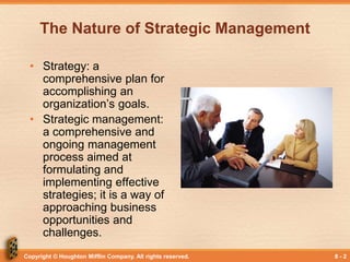 This document provides an overview of strategic management and strategic planning. It discusses key concepts such as strategy, strategic management, the components of an effective strategy. It also covers various strategic alternatives for businesses and corporations, including Porter's generic strategies, the Miles and Snow typology, and strategies based on the product life cycle. Finally, it discusses strategic implementation and the use of tools like SWOT analysis and the BCG matrix to formulate corporate strategies.