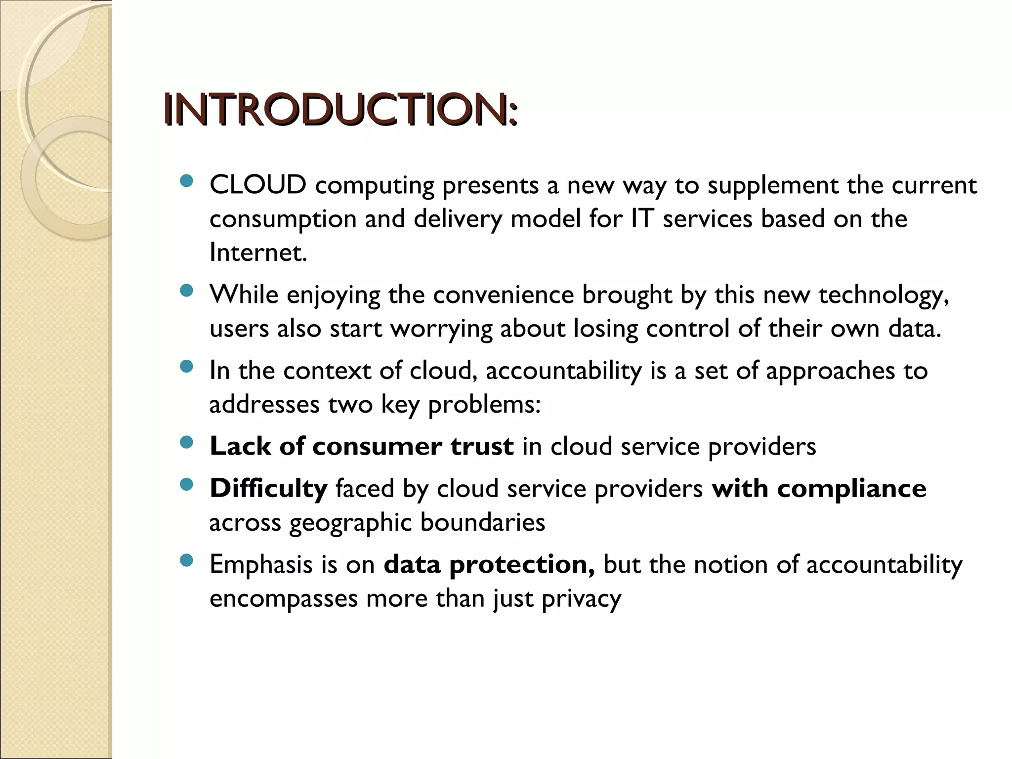 This document proposes a Cloud Information Accountability (CIA) framework to address lack of trust and compliance issues in cloud computing. The CIA framework uses a decentralized logging and auditing approach to track data usage in dynamic cloud environments. It includes a logger that is coupled with user data and policies to log all access, and a log harmonizer that periodically sends logs to data owners for auditing. The proposed approach aims to provide transparency, enforce usage controls, and strengthen user control over their cloud data.