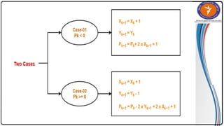 The document summarizes the midpoint circle algorithm. It explains that the algorithm takes a center point and radius as inputs and generates points on the circumference of a circle by starting at one point and using a decision parameter P to iteratively calculate the next point. It provides pseudocode for the algorithm's steps. As an example, it applies the algorithm to generate all points of a circle with center (0,0) and radius 10. The document also lists advantages like its simplicity and efficiency, and disadvantages like lower accuracy and being time consuming compared to Bresenham's circle algorithm.