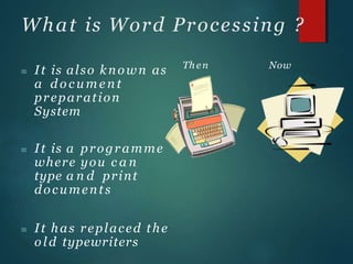 Word processing is a program that allows users to type, edit, and print documents. It has replaced typewriters. Word processing can be used for business, education, and personal documents. It offers advantages like faster editing, font formatting, printing multiple copies, and adding images. Newer versions of word processing programs include features like spell check, grammar check, templates, mail merge, and WYSIWYG display. The interface of word processing programs has evolved over time from menus and toolbars to the modern ribbon system seen in Microsoft Word 2007 and later.