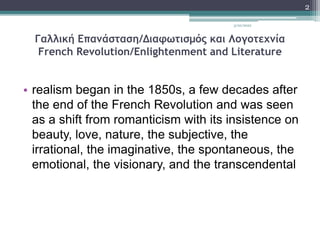This document discusses the link between George Vizyenos' narrative style and Victorian literary realism. It provides historical context about the social changes resulting from the French Revolution and industrialization. Realistic Victorian literature emerged in this era, portraying everyday lives and characters from a range of social classes. The document analyzes how Vizyenos adopted conventions of realistic narrative, like suspense, complex characterization, and psychological insight, rather than romanticizing nature. He focused on revealing emotional truths behind real-life events and developing characters that change based on new understandings.