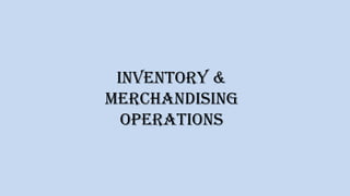 The document outlines key learning objectives related to inventory and merchandising operations, including inventory valuation, cost assumptions, and the impact of inventory errors on financial statements. It discusses various inventory costing methods such as FIFO, LIFO, and the average cost method, alongside their implications on cost of goods sold and gross profit. Additionally, it covers the evaluation of retail operations using inventory-related financial ratios and adheres to standards such as the lower of cost or net realizable value.