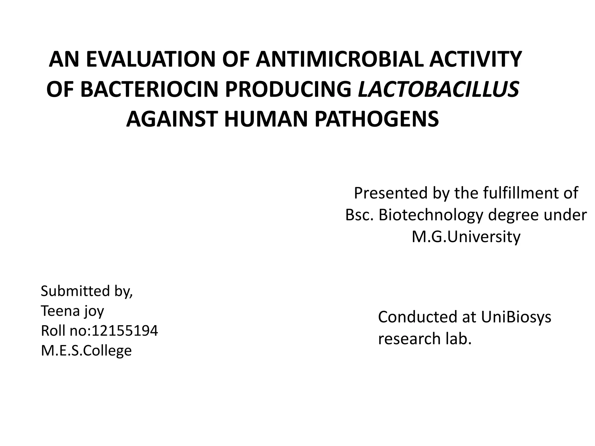 The document evaluates the antimicrobial activity of bacteriocin produced by Lactobacillus isolated from curd samples against human pathogens. Lactic acid bacteria were isolated from curd using MRS media and identified through morphological and biochemical tests as Lactobacillus species. The isolated Lactobacillus strains were screened for their ability to produce bacteriocin exhibiting antagonistic activity against indicator strains like E. coli and Staphylococcus aureus using agar well diffusion assays. Clear inhibition zones were observed around the wells indicating the isolated Lactobacillus strains could produce bacteriocin with antimicrobial activity against pathogens.