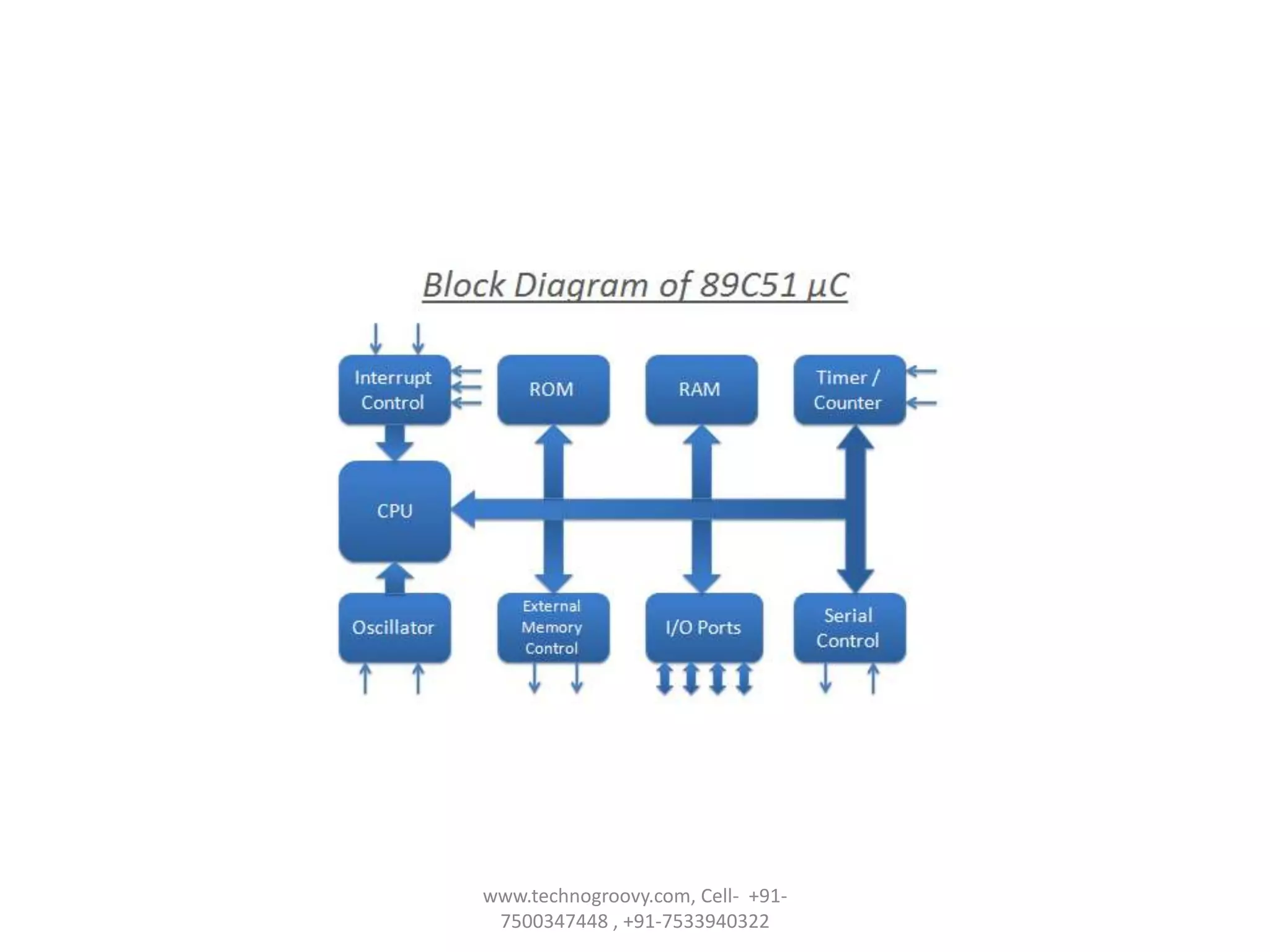 The document provides detailed information about the AT89C51 microcontroller, including its pinout configurations, port functionalities, and special function registers (SFRs). It explains the purpose of various pins, such as input/output ports and their alternate functions, along with activation methods for resets and external memory access. Additionally, it outlines instruction examples for programming the microcontroller and provides contact information for Technogroovy Systems India Pvt Ltd.