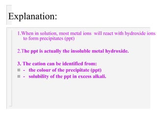 This document discusses reagents used to test for cations and identifies several common cations that can be tested for. Sodium hydroxide and ammonia solutions are used as they contain hydroxide ions, which will react with most metal ions to form precipitates of insoluble metal hydroxides. The cation can then be identified based on the color and solubility of the precipitate, with the document listing sodium, potassium, calcium, aluminium, lead, zinc, iron(II), iron(III), copper(II) and ammonium as some common cations that can be identified.
