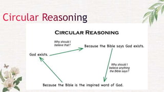 This document provides definitions and examples of various logical fallacies. It begins by explaining that fallacies are flawed or dishonest arguments that can undermine the credibility of the writer. It emphasizes the importance of learning to identify fallacies in one's own arguments and those of others. The document then proceeds to define and provide examples of over 20 specific logical fallacies, including genetic fallacy, argumentum ad hominem, appeal to popularity, appeal to tradition, appeal to authority, argument from consequences, and others. It concludes by noting there are also component fallacies related to inductive and deductive reasoning.