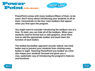 The document provides guidance for teaching PowerPoint to students by introducing essential terminology, toolbars, and the Office Assistant in a systematic way. It recommends demonstrating PowerPoint vocabulary, introducing the four main toolbars one at a time to prevent clicking every button, and considering whether the Office Assistant will benefit students based on their abilities and available class time.