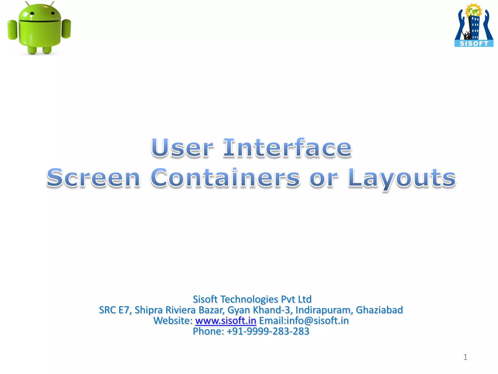 The document provides an overview of Android user interface components. It discusses that an Activity contains screens composed of components or screen containers called View Groups or Layouts. Layouts define the arrangement of components. There are six main types of Layouts: LinearLayout, RelativeLayout, TableLayout, FrameLayout, AbsoluteLayout, and GridLayout. It also describes Views, ViewGroups, and how components are specified in XML layout files or programmatically.