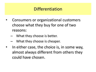This document discusses brand differentiation and positioning. It outlines a 7-step brand positioning process: 1) identify competitors, 2) determine attributes, 3) collect customer perceptions, 4) analyze positions, 5) determine preferred attributes, 6) consider segment fit, 7) create a positioning statement. Positioning seeks to create physical and perceptual differences to appeal to customers. Both physical and perceptual attributes should be considered. The goal is to establish a unique position to build brand equity.