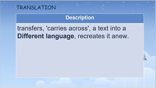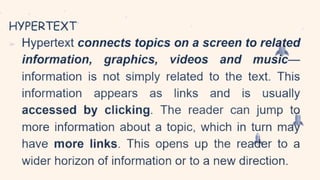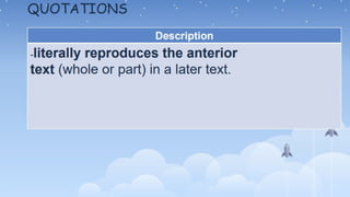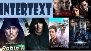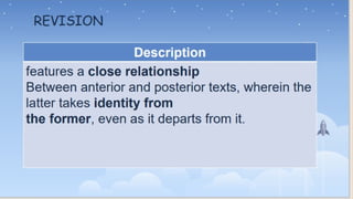 The document defines intertextuality as a process wherein a text develops by merging imitation and creation, influenced by the works of previous authors. It details methods of retelling and allusion as ways writers incorporate references to other texts, such as using phrases or themes without direct copying. The concept, rooted in Ferdinand de Saussure's linguistics and popularized by Julia Kristeva in the 1960s, reflects how texts interact and influence each other.