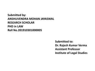 This document provides an introduction and synopsis of a research paper titled "AN ABSOLUTE LIABILITY IN INDIA WITH SPECIAL REFERENCE TO INDUSTRIAL DAMAGES." It discusses the rule of absolute liability established by the Supreme Court of India, compensation laws and statutes in India, issues related to industrial hazards and toxic waste, and aims to analyze the need for absolute liability in India with respect to industrial damages through comparative study and evaluation of judicial decisions and legal frameworks. The document outlines several hypotheses related to replacing the rule of strict liability with absolute liability, adequacy of compensation laws, need for consolidation of social security laws, and lack of implementation and monitoring of safety measures in industries.