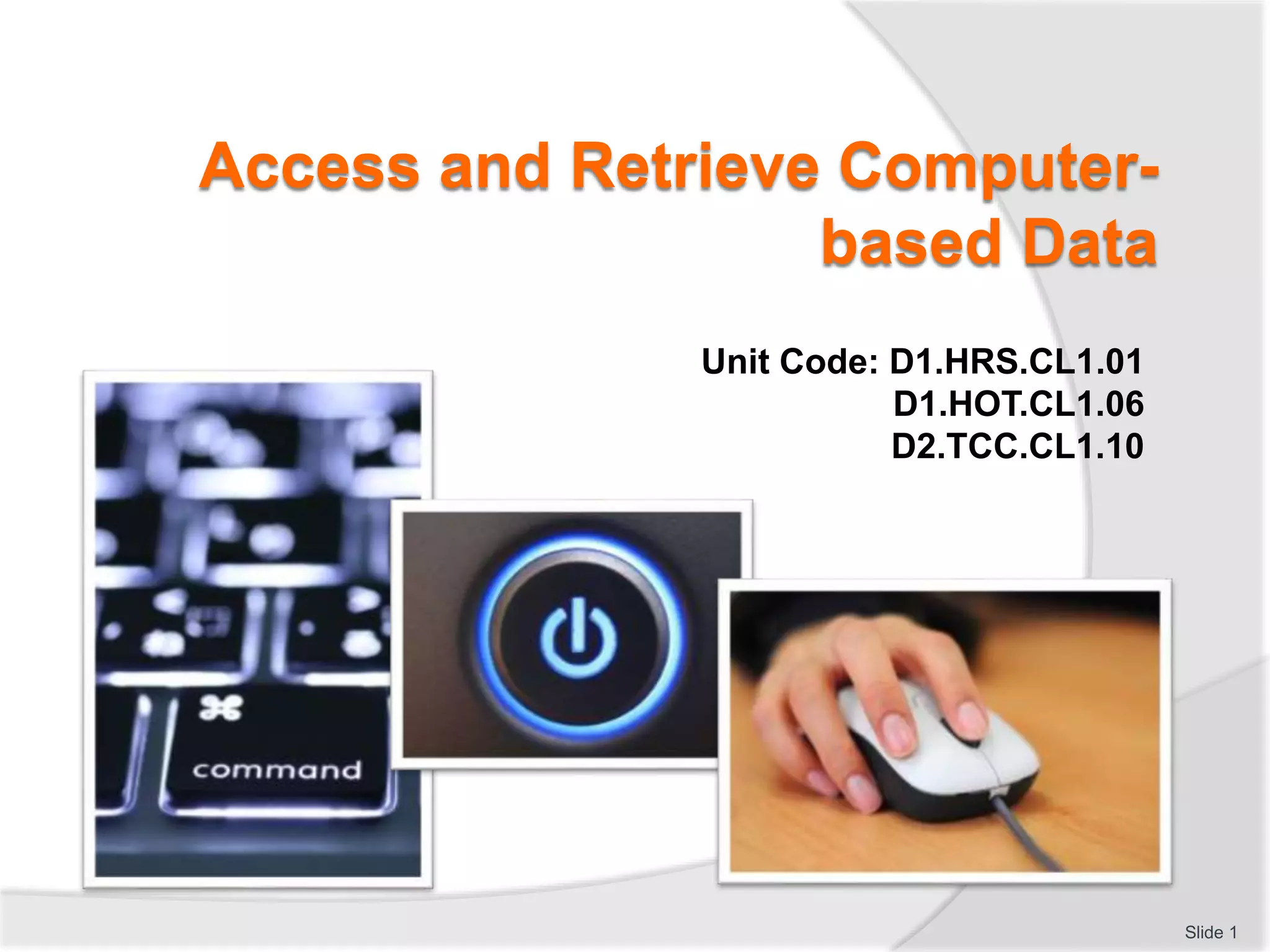 This document provides instructions for accessing and retrieving computer-based data using various programs and devices. It discusses how to turn on a computer, log in, access common programs like Word and Excel, find files, use storage devices, understand file extensions, search for files and text, sort and filter data, use queries in Access, search the internet, and print from different programs. The document is formatted as a slide presentation covering these computer skills topics over 41 slides with instructions and exercises for each skill.