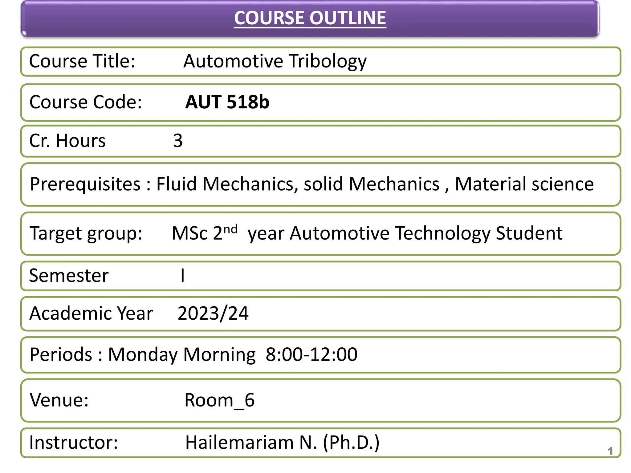 This is a 3 credit hour course on Automotive Tribology for 2nd year MSc Automotive Technology students. It will be held on Mondays from 8:00-12:00 in Room 6. The course outline includes chapters on friction and wear of metal surfaces, introduction to solid surface characterization, and friction and wear mechanisms. Assessment will include deliverables related to chapter two on friction and wear of metal surfaces. The course instructor is Hailemariam N.