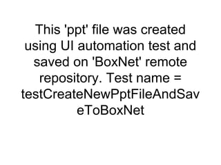 A PowerPoint file was created using UI automation testing and saved to the BoxNet remote repository. The test was named testCreateNewPptFileAndSaveToBoxNet.