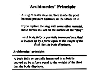 This document provides an introduction to fluid mechanics. It begins by defining mechanics, statics, dynamics, and fluid mechanics. Fluid mechanics deals with fluids at rest or in motion and their interaction with boundaries. The study of fluids at rest is called fluid statics, while considering pressure forces is called fluid dynamics. Fluid mechanics is divided into several categories including hydrodynamics, hydraulics, gas dynamics, and aerodynamics. The document then defines what constitutes a fluid and distinguishes between liquids and gases. It provides examples of applications of fluid mechanics in various engineering fields and classifies different types of fluid flows. Finally, it defines important fluid properties such as density, specific weight, specific volume, and viscosity.