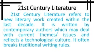The document discusses various 21st century literary genres including illustrated novels, digi-fiction, graphic novels, manga, doodle fiction, text-talk novels, chick lit, flash fiction, six-word flash fiction, creative non-fiction, science fiction, blogs, and hyper poetry. It provides examples and brief definitions of each genre, highlighting their innovative and technology-focused storytelling forms that often combine multiple media like text, images, and websites.