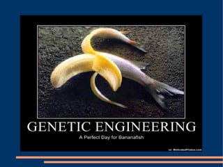 This document discusses genetic manipulation and bioethics. It explores the potential pros and cons of genetic engineering, such as using it to cure diseases but also potentially creating a subclass of "enhanced" humans. The purpose is to examine both sides of this issue and promote discussion around the possibilities and ethical implications of genetic science. Some of the pros mentioned are curing diseases like HIV/AIDS and growing new organs, while cons include unknown long-term risks and possible social effects like a subclass of citizens. The document questions where to draw the line with this technology.