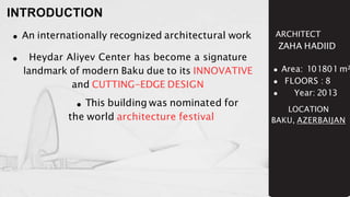 The Heydar Aliyev Center in Baku, Azerbaijan was designed by renowned architect Zaha Hadid. Measuring 101,801 square meters with 8 floors, the building was completed in 2013 and features an innovative cutting-edge design that establishes a continuous, fluid relationship between its interior and surrounding plaza. Through the use of concrete structure combined with a space frame system, the Center achieves large column-free exhibition and event spaces.