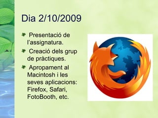 Dia 2/10/2009 Presentació de l’assignatura. Creació dels grup de pràctiques. Apropament al Macintosh i les seves aplicacions: Firefox, Safari, FotoBooth, etc.
