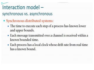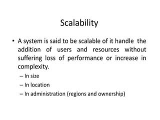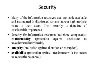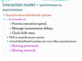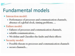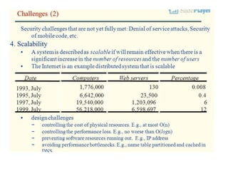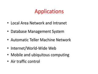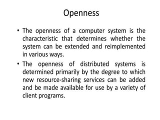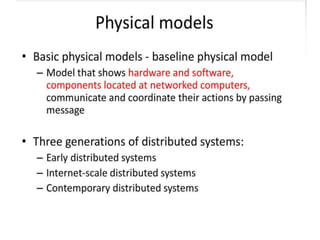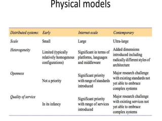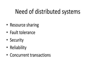 This document provides an overview of distributed systems. It discusses different types of distributed systems like client-server, n-tier, and peer-to-peer systems. It outlines advantages like performance, reliability, and scalability. Challenges include networking and security issues. Key features are discussed such as concurrency, lack of a global clock, and independent failures. Characteristics of distributed systems include heterogeneity, openness, security, scalability, failure handling, concurrency, and transparency. Examples provided are the Internet, intranets, and mobile/ubiquitous computing systems.
