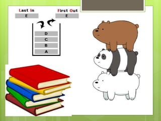 Dokumen ini menjelaskan tentang struktur data stack, termasuk definisi, operasi dasar seperti push dan pop, serta pengimplementasian menggunakan array dan linked list. Stack memiliki karakteristik LIFO (last in first out) dan digunakan dalam berbagai aplikasi seperti history pada web browser dan algoritma backtracking. Contoh penggunaan stack dalam ekspresi aritmatika juga diberikan serta perbandingan antara notasi infix, postfix, dan prefix.